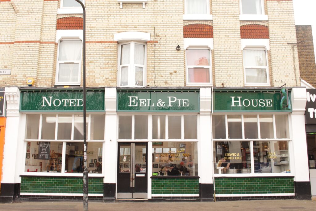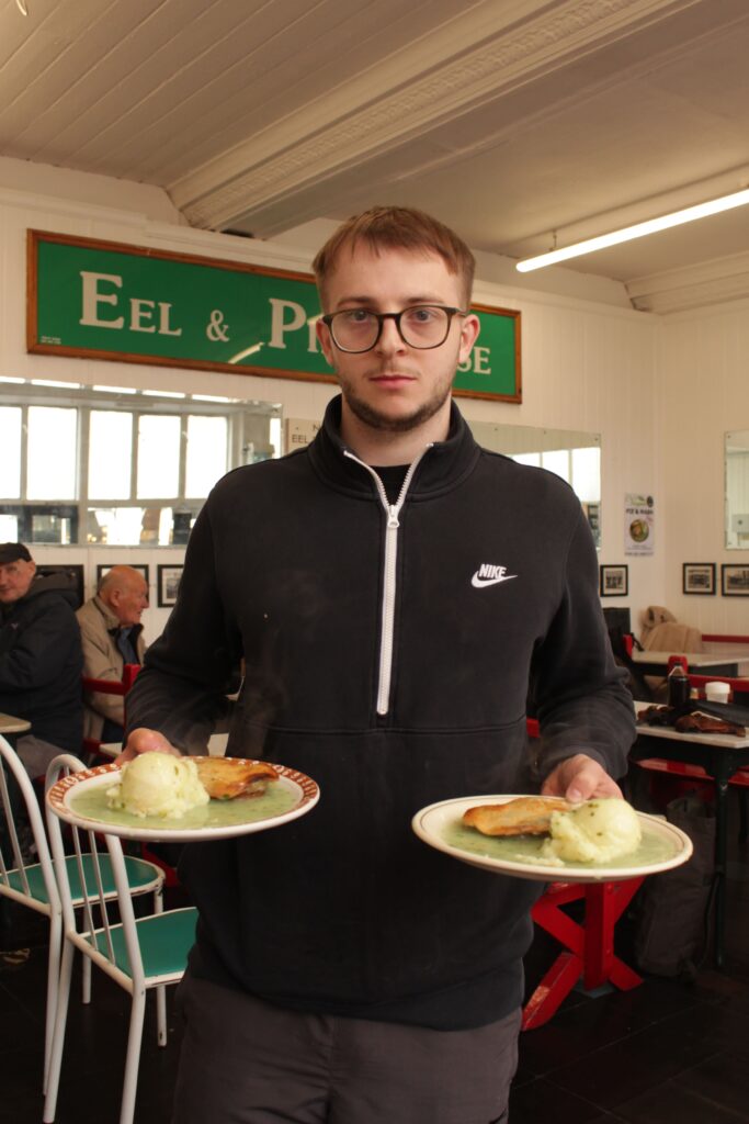À Leytonstone, ces deux plats traditionnels se repèrent de loin sur la façade verte de Noted Eel & Pie. Alfie en est le gérant depuis avril 2025, quatrième génération d’une famille installée ici depuis 1926. À l’intérieur, rien n’a vraiment changé depuis des décennies : tables en marbre, bancs alignés, photos de famille au mur, menu écrit à la main sur un panneau, odeur de persil qui emplit le restaurant.