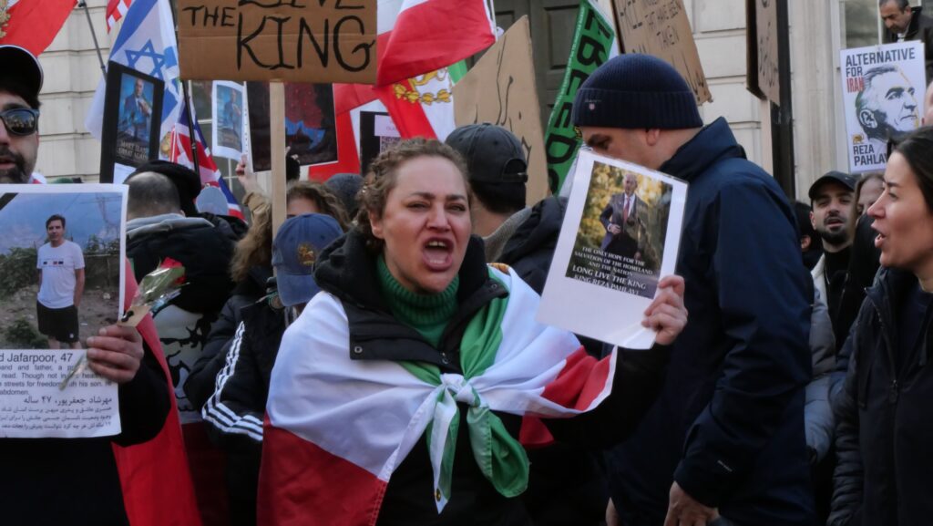 Pendant deux heures, les slogans s’enchaînent. Attendant patiemment la prise de parole de Reza Pahlavi, la foule clame « Javid Shah ! » (« Vive le Roi ! »). Il est 16 heures. Sur un écran géant noir installé aux abords de Westminster – quartier du centre de Londres –, l’ancien prince héritier s’avance au pupitre. Il est retransmis en direct de Munich en Allemagne, où près de 200 000 personnes sont rassemblées pour soutenir le leader de l’opposition iranienne. « Je m’engage à être le leader de la transition démocratique et laïque en Iran, déclare-t-il avant d’ajouter, Make Iran Great Again », en référence à la campagne politique de Donald Trump.
