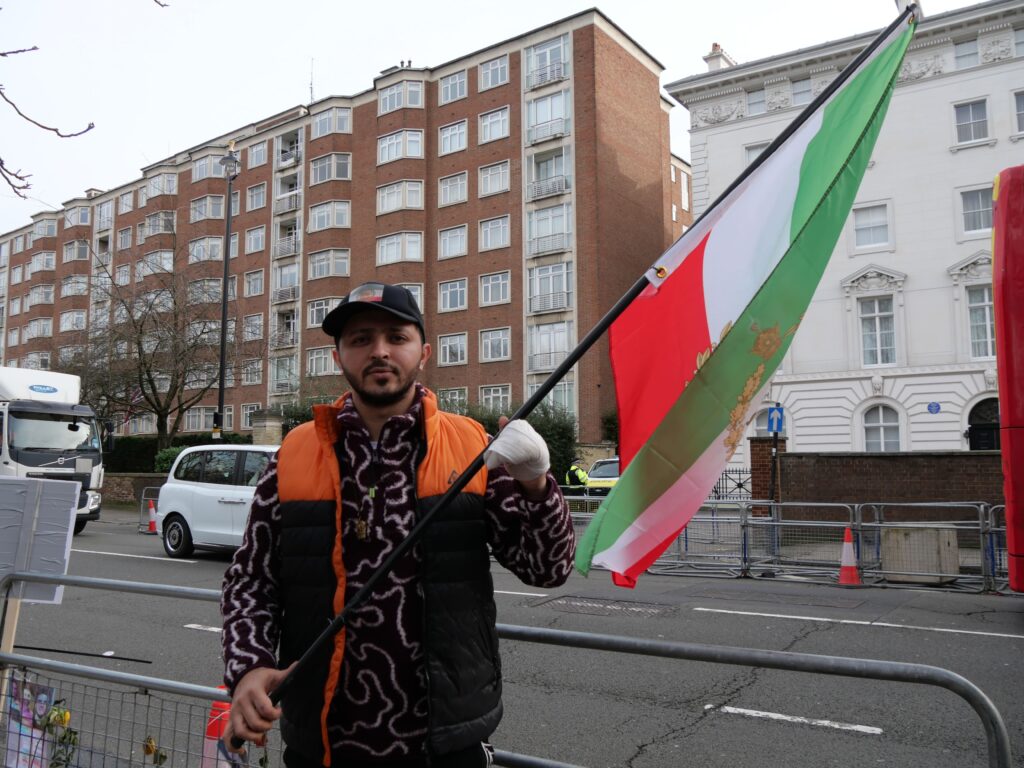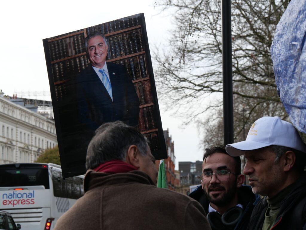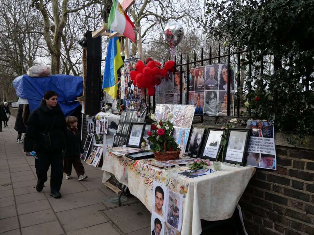 Si les manifestations ont lieu tous les samedis devant Downing Street, d’autres rassemblements plus intimistes s’improvisent devant l’ambassade de la République islamique d’Iran à Knightsbridge, quartier central de Londres. Mahan Mehrani se présente comme une « voix pour le peuple iranien ». L’activiste a inauguré un espace de recueillement aux abords du parc de Kensington et un autel à l’effigie de Reza Pahlavi, qu’il soutient depuis six ans. À seulement 29 ans, l’interprète irano-kurde manifeste nuit et jour pour son pays.