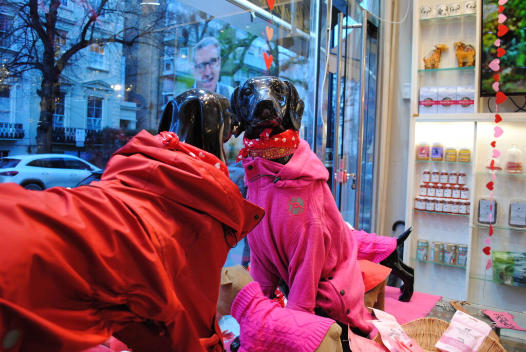 Tout de suite, sa vitrine accroche le regard. Dans ce quartier huppé de Notting Hill situé en plein cœur de Londres – elle détonne presque. Pour la Saint-Valentin, Andre Carless a mis le paquet. Suspendus a des fils, des myriades de petit cœur en papier tombent du plafond. Au centre, trônent deux statues de chien noires à l’aspect brillant. Elles sont vêtues de combinaison rouge et rose flashy. Comptez 75 livres (86 euros) pour la combinaison « Coco » (rose) et 95 livres (109,25 euros) pour la « Sebastian » (rouge). Pour agrémenter ce tableau romantique, des dizaines de peluches ont été disposées en bas de la vitrine ainsi qu’un énorme cœur, rouge, gonflable.