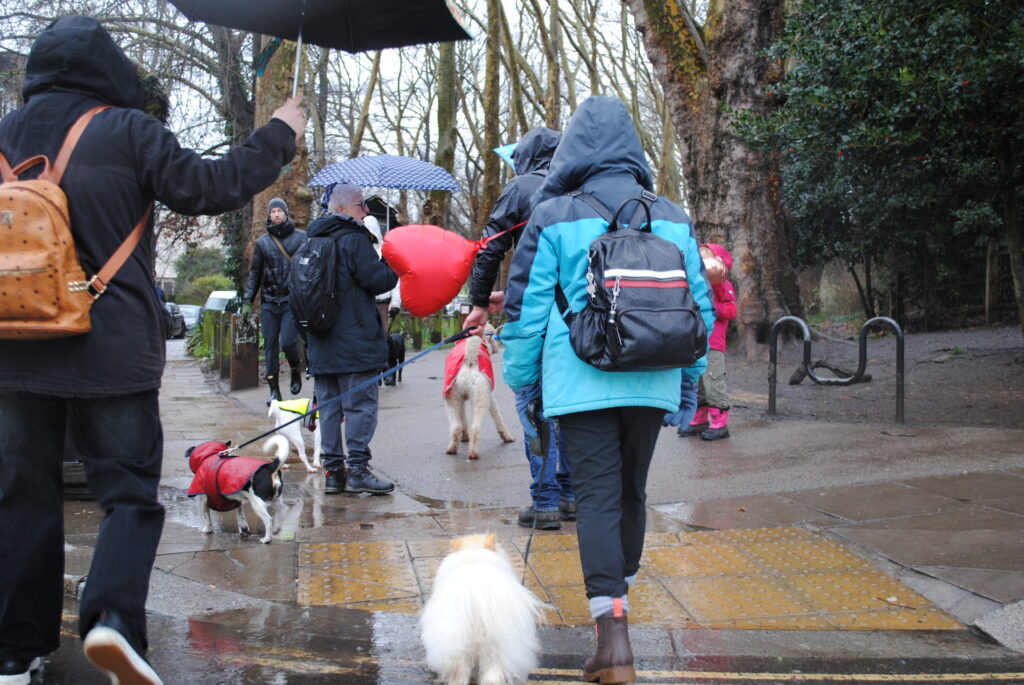 Ce matin-là, malgré la pluie et la boue, le Jack Russell de Simon Happily remue la queue. Sous sa combinaison rouge, il trépigne d’impatience. Pour cette marche de la Saint-Valentin, certains toutous revêtent des tenues romantiques comme ce cockapoo au pelage caramel, fagoté d’un imperméable rose tacheté de petits cœurs rouges. « On devait accueillir beaucoup plus de monde mais la pluie en a choisi autrement », sourit Simon Happily, bénévole de All dogs matter, une association britannique de protection animale basée à Londres. Depuis 2009, la structure a sauvé et replacé entre 350 et 400 chiens par an. Ce dimanche, environ 80 personnes ont bravé la mauvaise météo pour soutenir l’évènement caritatif. Cette année, 300 livres (345 €) ont été récoltés, contre 1 150 € l’année précédente.